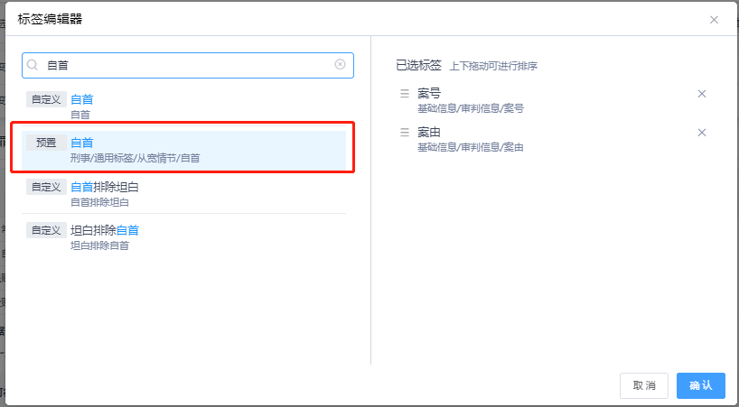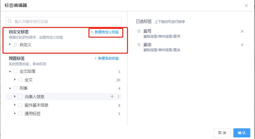 第二步:点击【添加标签】,先查询小包公实证分析系统的预置标签中有无自己的目标标签,如果没有目标标签,则点击【新建自定义标签】来添加自己的目标标签。