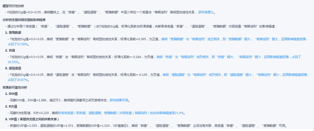 如图所示,自变量受贿数额的标准化系数占比最大,标准化系数为正值,因而受贿数额在这三个自变量中对判处被告人多久的有期徒刑而言影响是最大的,且该自变量对因变量(有期徒刑)的影响是正向的,也就是说,受贿数额越大,判处的有期徒刑的刑期就越多。