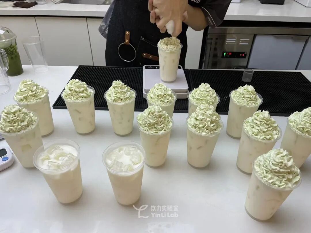 据品牌方介绍,晨非420克/罐规格的喷射雪顶,售价25~30元。我们对其硬产率、应用成本做了测试,按照门店雪顶的呈现效果,连续打了2罐全新的产品。带包装整罐重量530克,打完后罐总重160克,产品规格420克,硬产率为88%。80口径的杯子,每个雪顶所需22克左右,能打16个,单杯成本1.7元/个;门店常用90口径的杯子,每个雪顶为32克左右,能打12个,单杯成本2元/个。饮力实验室曾做过雪顶产品的对比测试,根据市面常规价格测算,奶油枪打雪顶及常见喷射奶油,单个成本多在2.5~3元/个。可以发现,单个产品0.5~1元的价格差,晨非雪顶是存在成本优势的。