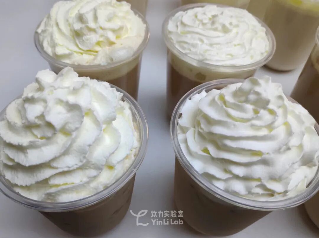 还可以用燕麦浆、椰浆等等,根据市面上流行的产品风味做原料调整。比如,收到测试的香草风味喷射奶油,打出的奶油状态并不十分光滑、细腻。据了解,这是根据品牌需求定制的产品,在品牌需求里,蓬松感强的状态看起来不腻、更清爽,适合夏季上架使用。左右不同顺滑度、细腻度
