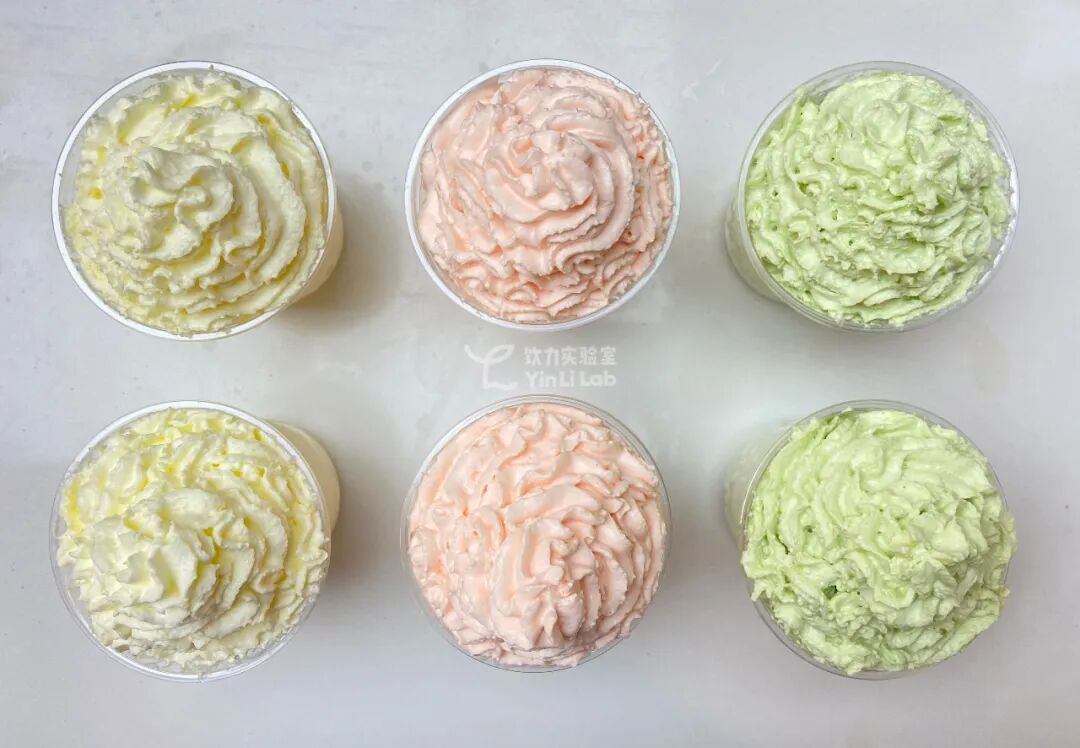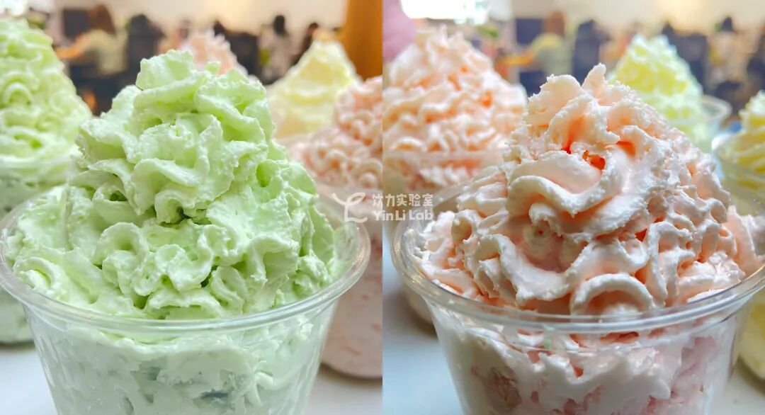 我们再选择香草风味、牛油果风味、樱花风味的产品,进行感官层面的风味、香气测试,和性能上的打发率、膨化效果等测试。可以发现:颜色、风味上,牛油果、樱花都可以呈现出实际的色彩效果;在风味上也能还原出相应香气。牛油果风味(左),樱花风味(右)