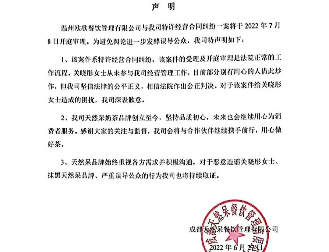 当天中午,奶茶品牌“天然呆”就特许经营合同纠纷一案发布声明。