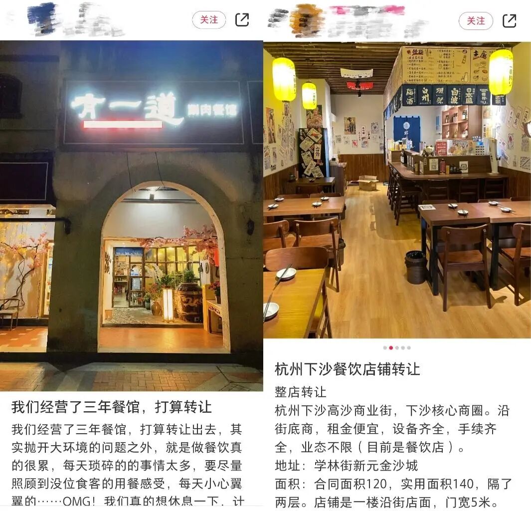 一些位置成功租出去了,从前门店的位置给新品牌围挡起来。还有一些店虽然还在营业,但营业时间大幅缩短,老板拍下前厅后厨图片,图文并茂地发布转让信息。