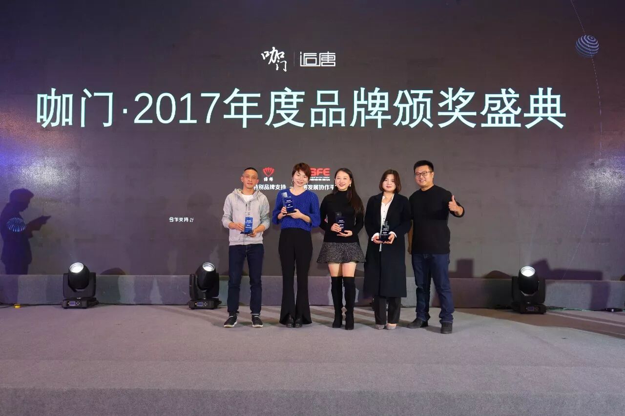 ▲最后,是颁奖盛典环节,咖门·2017年度最具成长性品牌大奖、最具潮流引领力品牌大奖、最具爆发力品牌大奖、产业链先锋品牌大奖,分别由SeesawCoffee、奈雪の茶、喜茶、麦隆咖啡获得,咖门创始人路文兵为获奖品牌颁奖并合影留念