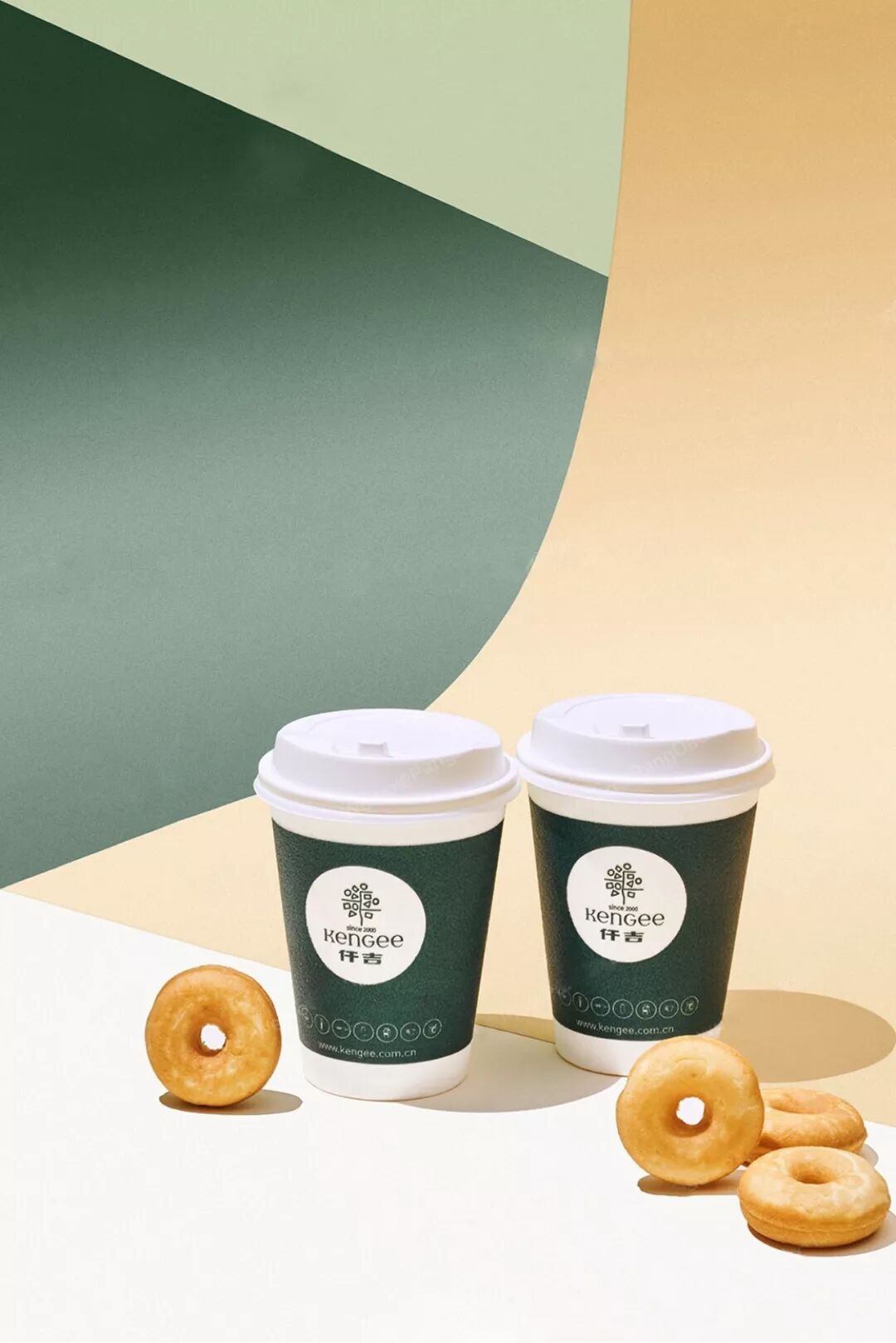 这是一张莫兰迪色系搭配的产品照。场景中绿色的杯子、棕黄色的甜甜圈,与背景色前后呼应,深浅错落中提升场景的层次感。4块甜甜圈,有平放的有立起来的,画面一下变得有动态的感觉。