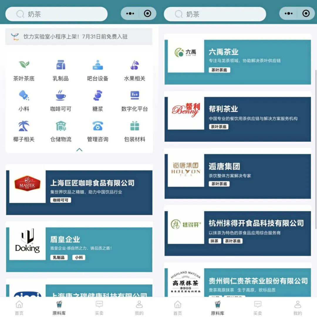 茶叶、设备、乳制品、数字化平台、仓储物流等等类别供应商都会在小程序聚集。