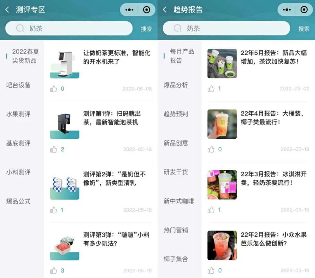 新品测评、免费试样:最新流行的饮品原物料,这里可以深入解析及测评,通过视频、图文发布测评内容,还能直接免费试样;