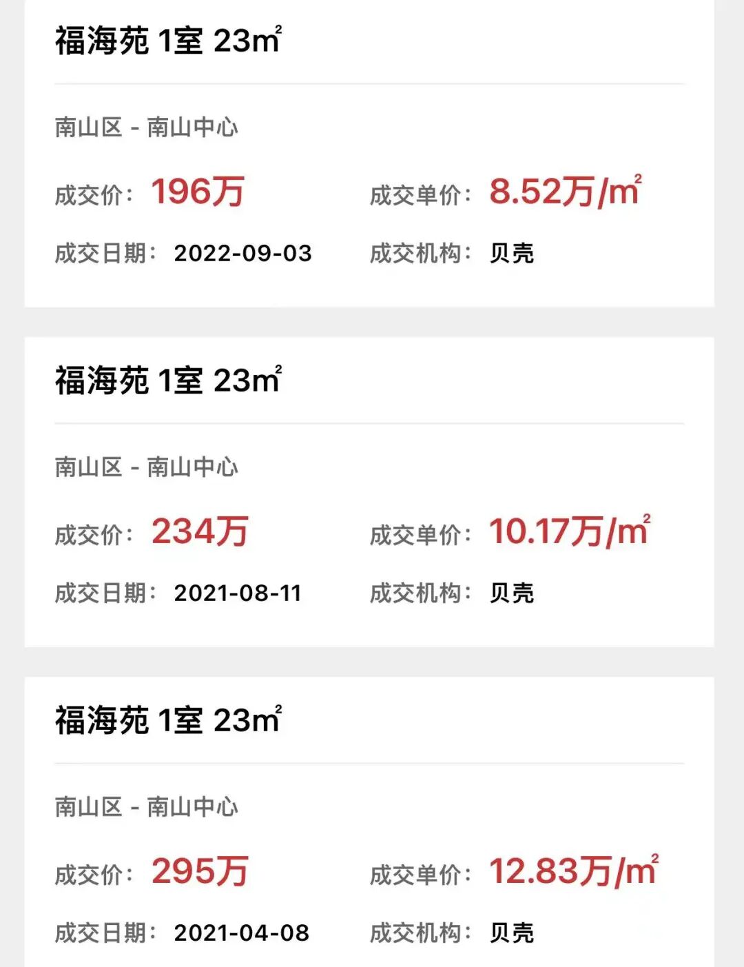 再举个例子,南山南油的福海苑23平的小房子,去年4月295万成交了一套,单价12.83万/平。我们年初的时候统计报价是300万。