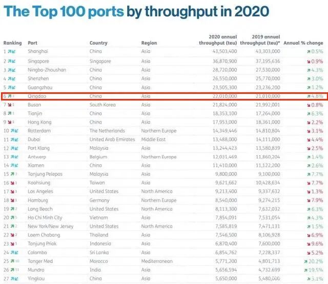 青岛港货物吞吐量超越新加坡港,跃居全球第5位;