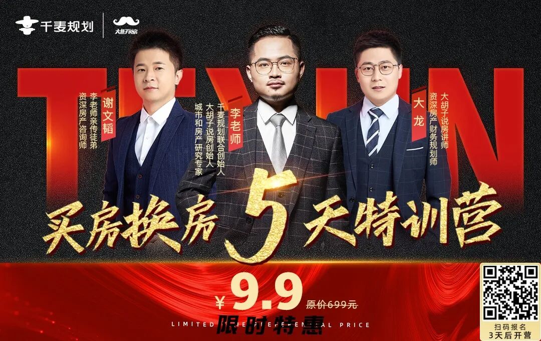 帮你抓住第三波买房赚钱的浪潮!大胡子团队重磅推出【5天买房换房特训营】,社群视频课+社群答疑+闭门直播课,从选房方法、避坑技巧到房产财务规划,助教老师1V1陪伴式教学,拆解经典案例,教你看懂楼市。9.9元扫码限时抢报,3天后正式拉群开营!
