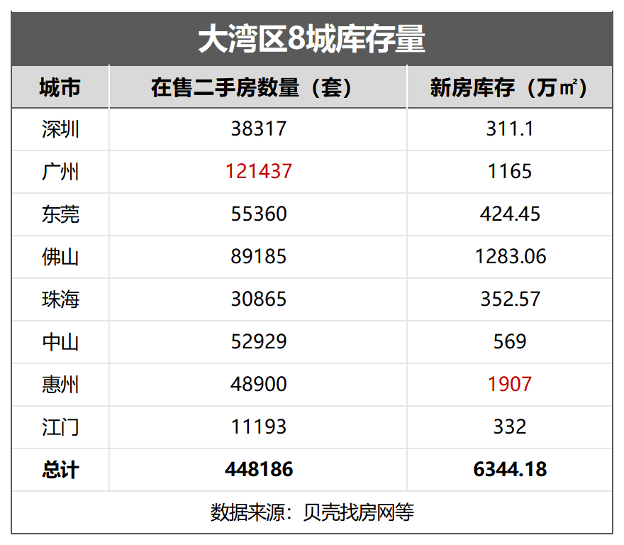目前,大湾区8城市二手房库存量总共44.8万套,新房库存总共6344.18万㎡,为了计算方便,假设按平均90㎡一套算,总共70.4万套新房库存。