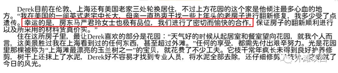 马严君玲目前生活在美国,上方花园的房子归在她名下。十多年前一个叫Derek Sulger(中国名:苏丹瑞) 的美国人看中了严宅,修复之后作为自己的上海寓所。下图是当年苏丹瑞整理好的花园和房间。