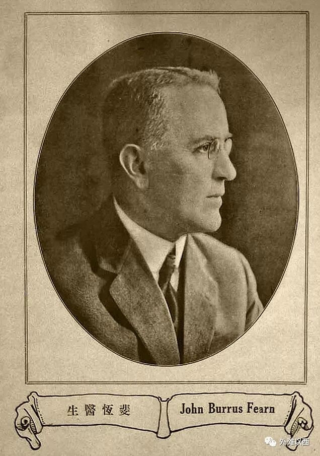 Fearn,John Burrus(1871年-1926年;斐恒/斐尧臣):美国监理会传教医师。1895年来华布道施医,驻苏州,在博习医院任职。1896年与美国长老会妇孺医院(Tooker Memorial Hospital for Women & Children )传教医师Anne Walter 结婚,一度转驻常熟。1907年从苏州返美休假。再次来华后转驻上海,在中西女塾任职。1917年离华参加欧战,以上尉衔在英国皇家陆军医疗总队服务。1919年返华,脱离监理会,就任上海公济医院住院院长,1926病故,葬静安寺外国坟山。一直在微博上整理和发布近代历史人物基础资料的“拉库爷爷”还告诉我们更多华安妮的情况:夫人则先后在沪开办斐恒女医生诊所和斐恒医院(Fearn’s Sanatorium),1938年告老回国,隔年去世,遗嘱将骨灰运回上海与夫同葬。斐恒夫人在上海外侨社交界很活跃,是美国妇女公会和美国乡下总会(Columbia Country Club)会员,且一度担任美国妇女公会会长,著有回忆录《我坚实的一生:一个美国女医生在中国的四十年》(My Days of Strength: An American Woman Doctor’s Forty Years in China)(1939)。