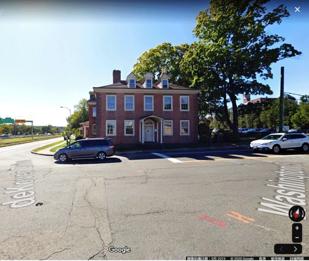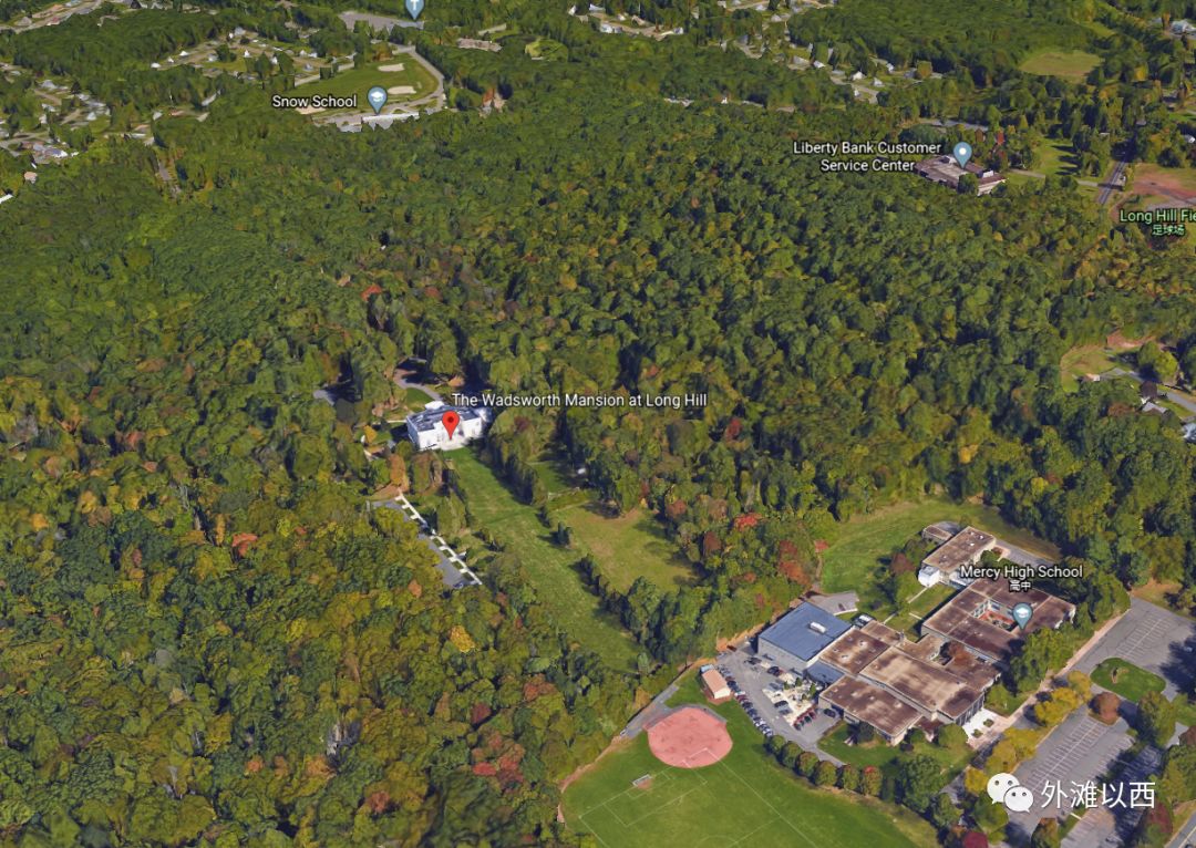 沃兹沃思大厦位于康涅狄格州421 Wadsworth St Middletown, CT 06457 。这是一栋16,000平方英尺的古典复兴式住宅,位于103英亩的林地上(维基百科),换算过来的话,房屋建筑面积约为1500平方米,那个占地面积绝对厉害,103英亩=625亩。下图是谷歌地球高空俯瞰,万绿丛中一栋楼。