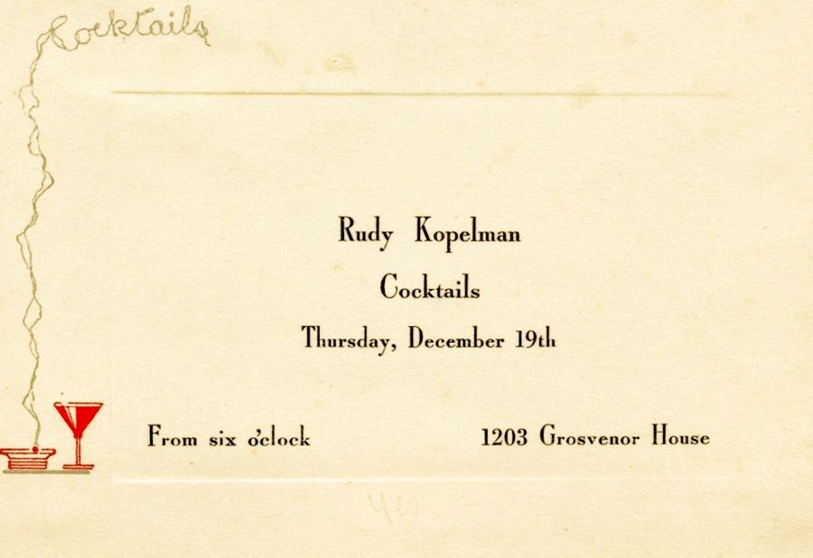 看看我们在picclick上找到的酒会请柬,落款都是峻岭公寓,都是抗战胜利后的欢乐今宵,一醉方休。1203室的住户叫Rudy Kopelman,科普曼先生邀请加拿大驻上海领事来喝酒,Rudy Kopelman invitation to Canada Consul Shanghai China 1946。