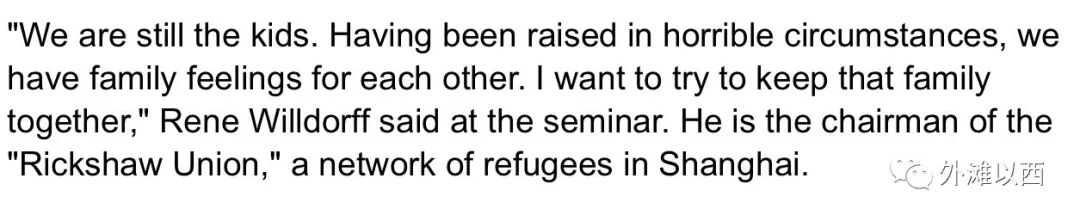 行文至此再写个温暖的上海故事,1930年代上海接纳了不少来自欧洲的犹太难民,他们在虹口霍山路惠民路一带有自己的社区,很早发现过一个叫“黄包车”的网站有当时犹太难民生活状况的照片,创办这个网站的是Rene Willdorff,小时候在上海生活过,现在点不开了,估计老人年事已高无法打理了。下图是他们前几年回上海和当地居民座谈,犹太社区里的黄包车奔来跑去,当时的小孩子也跟着跑跟着奔,他们有的是活力,不知道疲倦,也不知道前途在哪里?