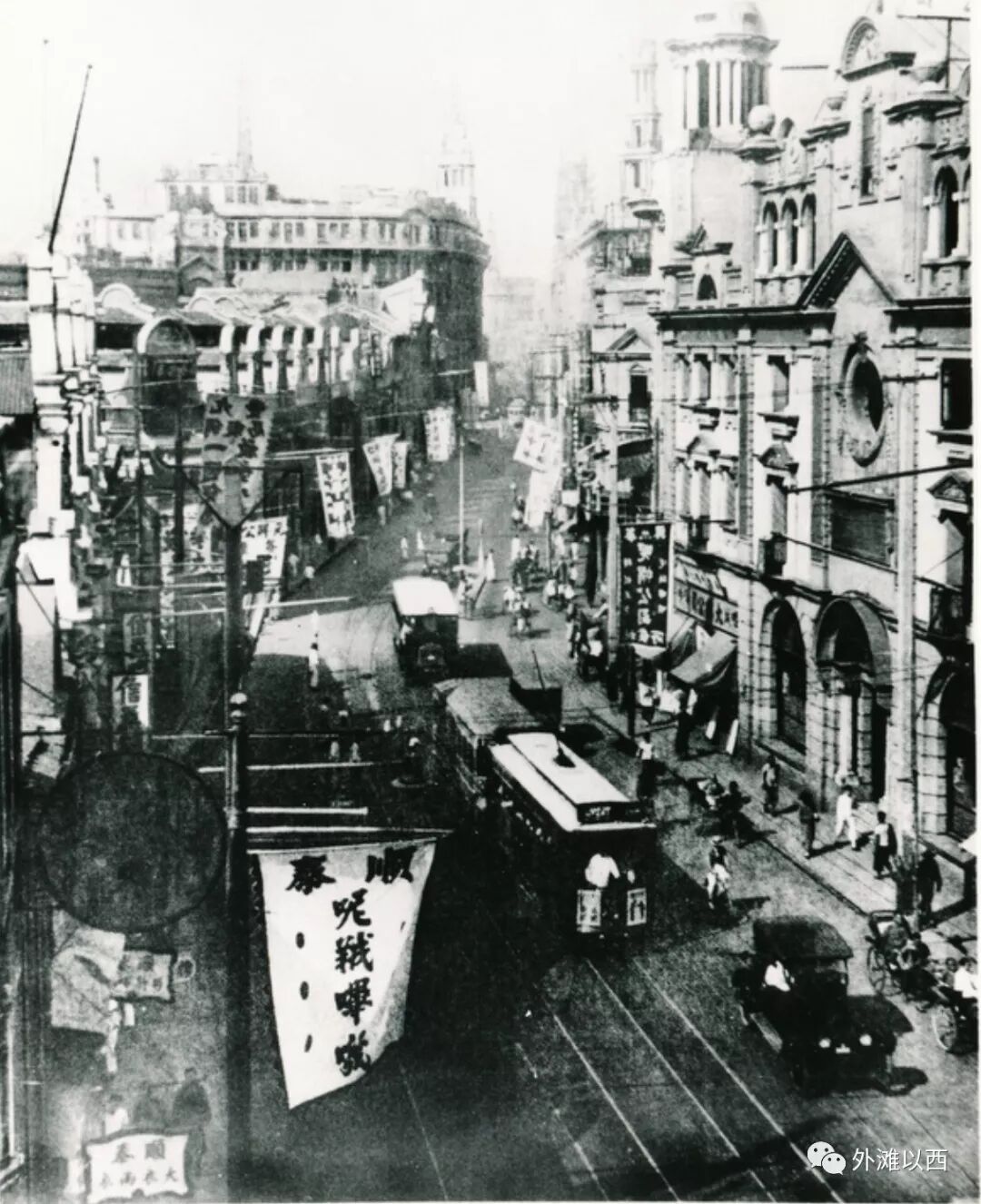拍摄者好奇是满路的广告旗帜和黄包车。