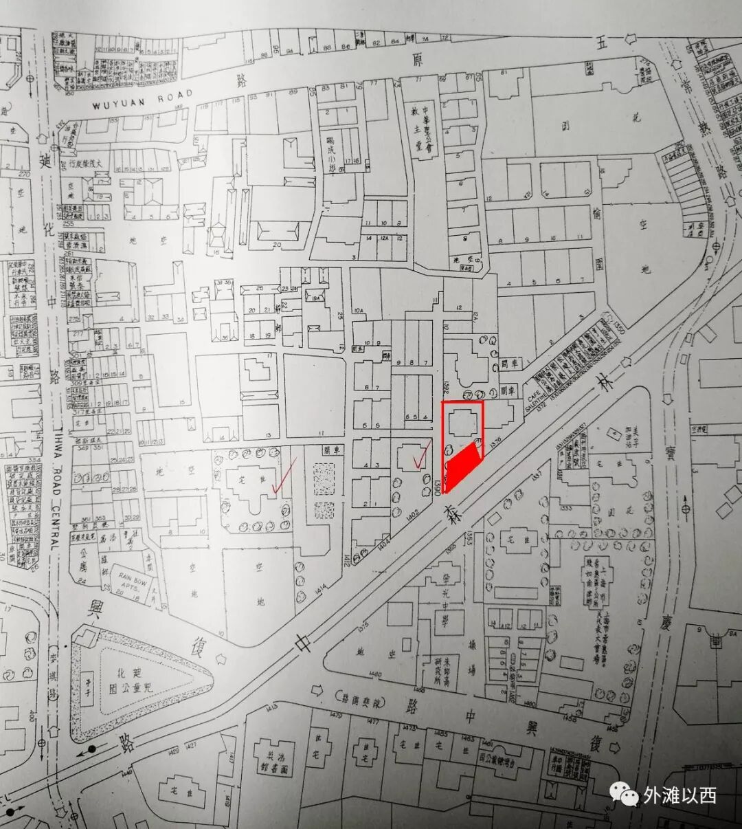 还有一个例子,因为我们曾在泰安路120弄和76弄反复做过调查,如下老地图上也做了标记,现在泰安路120弄32号属于1990年代建造在泰安路76弄6号大宅门花园上的新别墅。匆忙建造的别墅不太讲究造型,也和卫乐园整体风格有点不搭。