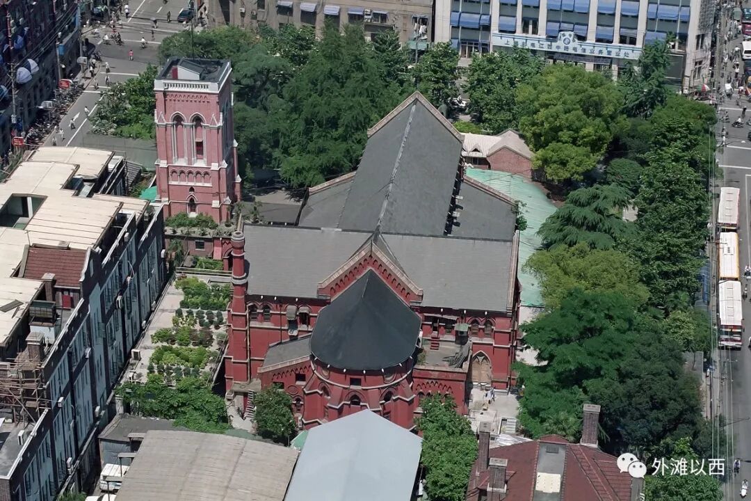 1893年Holy Trinity Church加盖钟楼后成为当时上海的第一高(该钟楼顶1966年毁,今已修复)。下图为未修复前有摄影者从街对面高楼俯瞰,图上绿意盎然,图右为49路公交车起点站。