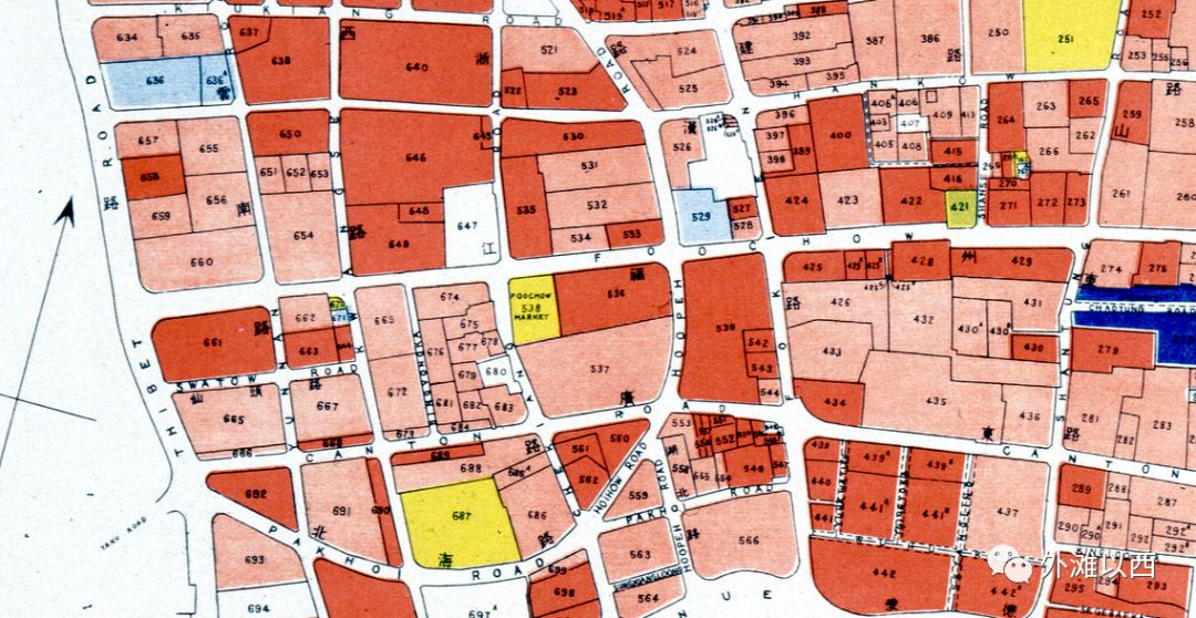 以上老地图和航拍照片里,我们都画了红线,日本人画的地图做了分块标注了什么人住什么区域。英国和美国永居地或者两国的商业用地在第一排。