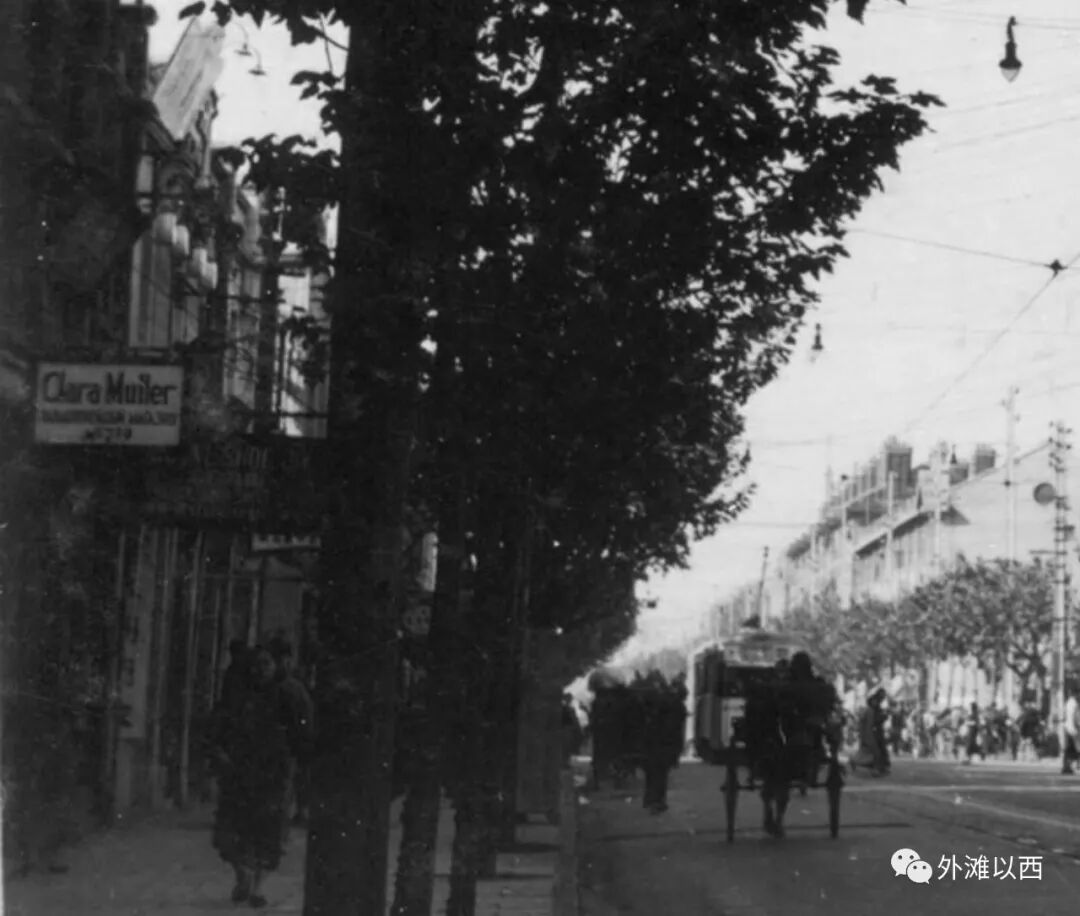下图的招牌还没有对应到具体的故事,但那时候这条街大多是外侨开设欧式商店,俄罗斯汉学家张霞收集了霞飞路很多的外侨店铺老照片,这个位置是今天的MUJI。我们意外发现了1980年代有外宾在这里骑自行车路过,路边的摄影师咔嚓了一下。