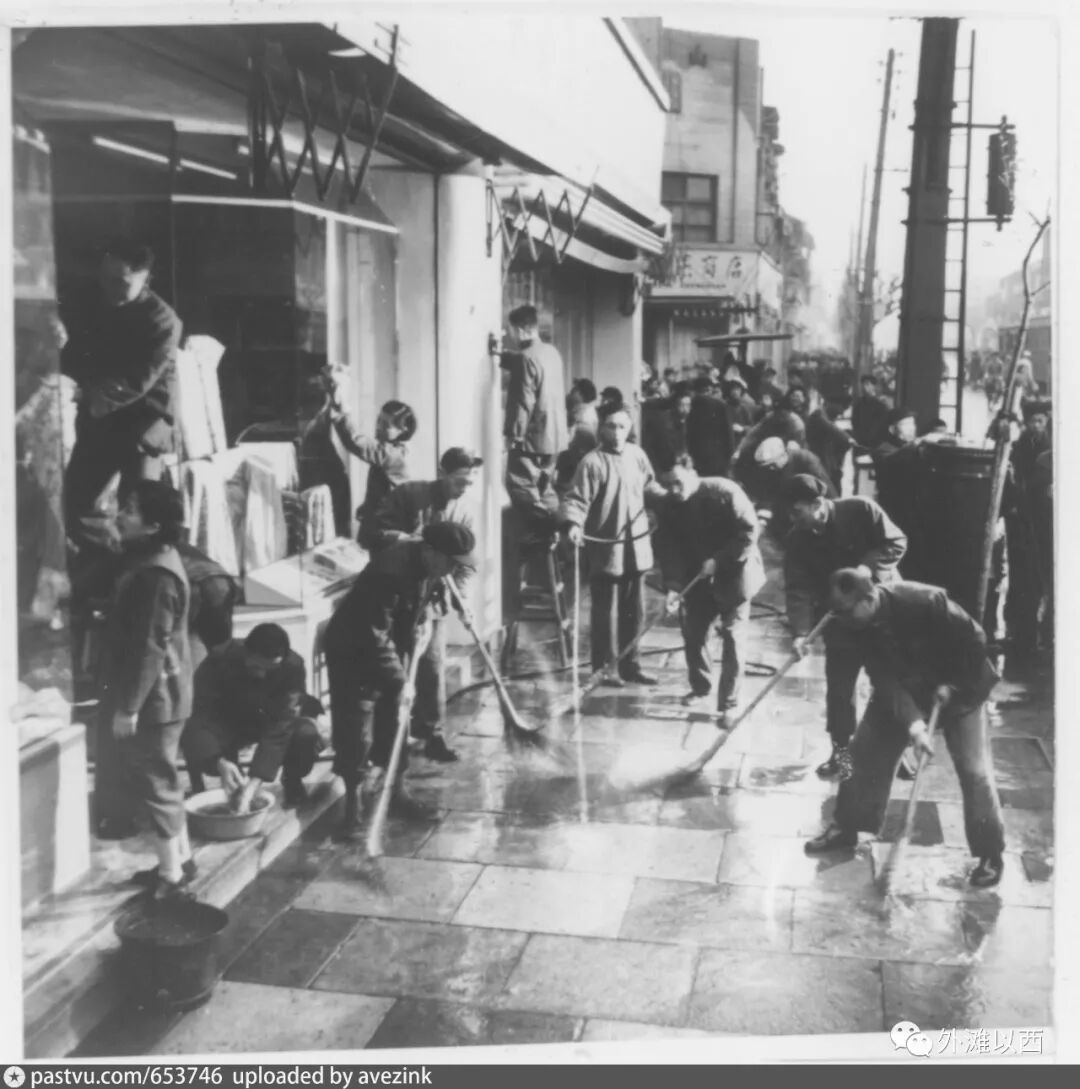 又找到一张历史照片,摆拍的痕迹很重。以前叫星期四爱国卫生义务大扫除,背景上没有了“卫生伙食公司”的店招牌,来了“泰山文化用品商店”。