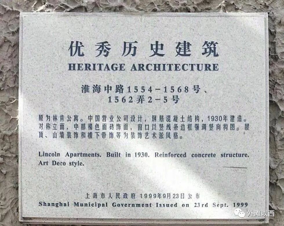 今天我们围着林肯公寓(淮海中路1554-1568号及1562弄)转个圈,非单栋公寓楼非街角八字楼,一个没有小区围墙的公寓组合,附近的曹家弄我们做过专题:《淮海中路1500号原是曹家弄 西区豪苑掩不住历史痕迹 永福路147弄探究竟》(链接点进去看看)。淮海中路上这样的老公寓组合还有泰山公寓(淮海中路622弄,那过街结构横梁显得很不自信)、盖司康公寓(淮海中路1202~1218号)等,但林肯公寓(现在叫曙光公寓但知道的人不多)属于上海人最喜欢的板式楼,可以的。