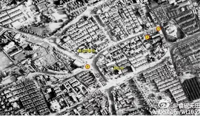 从食砚无田老法师的微博里发现了1940年代航拍照片,镜头正好对着静安寺地区,老法师要说的是如今环球大厦那块地皮原先一直是警察局,我们看到的是愚园路,静安寺隔壁的庙弄,英文名字叫Tample Lane。岔出去说说当年静安寺路(南京西路)从国际饭店开始一路到静安寺,头头子有Park Lane 今天的南京东路,过了成都北路后有Love Lane现在的吴江路斜桥弄,最后有庙弄Tample Lane,目前是静安寺和久光百货之间的步行街(东庙弄)。