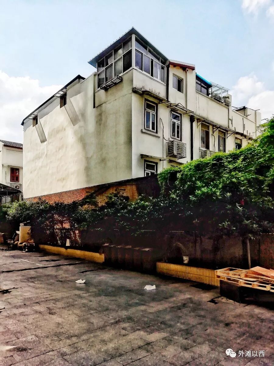 而在之前我们罗列的几位居住在四明邨的书画家,他们与冒广生都是同辈人,应该相互走动的,其中的吴徵(字待秋)自称鹭鸶湾人、春晖外史、抱鋗居士,更有和冒广生呼应的“抵苍亭长(栝苍亭长)”名号,冒广生喜欢用“小三吾亭长”自居得意,文人墨客的日子还是过得挺仙的。下图从东隔壁的一个自行车停车棚拍摄冒广生旧居,北窗户也设计得与众不同。