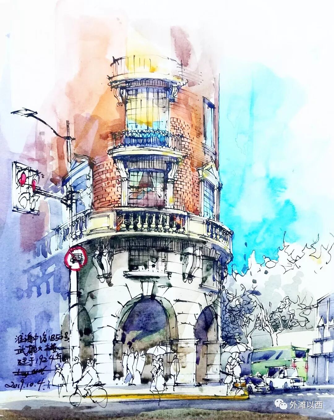 我们从大量的陆军街头钢笔淡彩画里找一些有我们专题报道过的老建筑,如常熟路上的瑞华公寓,链接点进去看看:《麦小姐的故事之16:1928年建造的瑞华公寓里那些外国人以及开发商林先生传说和考证》。
