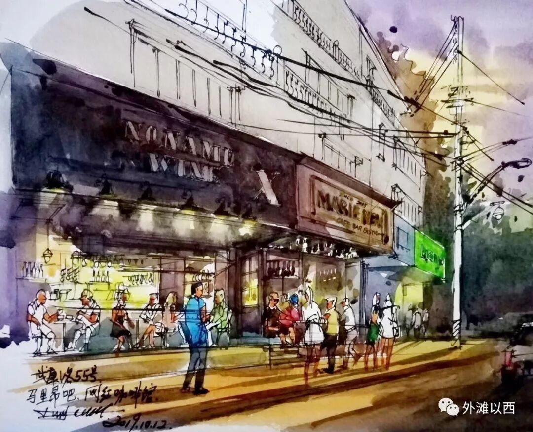 在马里昂吧等陆军先生的时候一直在翻他朋友圈发的街头钢笔淡彩画,那些一直路过的熟悉的“永不拓宽”的街道又有了画家陆军赋予的灵性和意义。