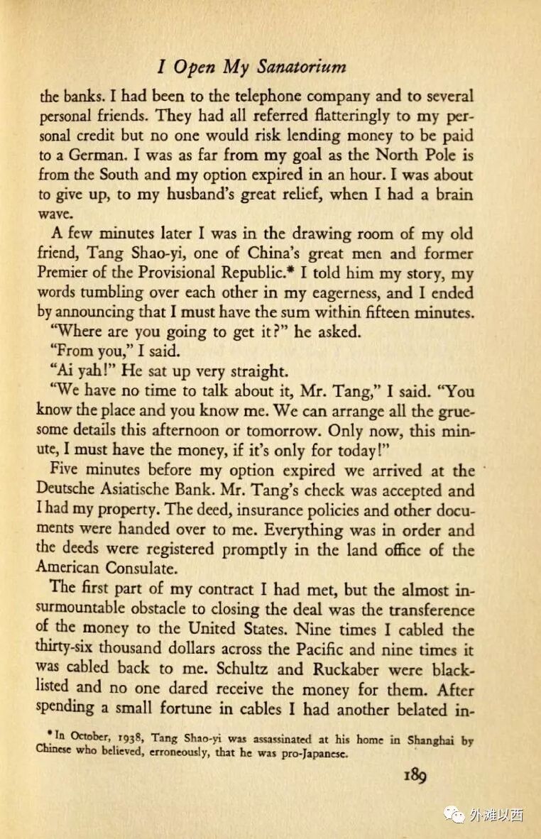One night, almost on the stroke of twelve, I was awakened by the ringing of the telephone bell beside my bed. At the other end was Mr.Gerecke.Under stress of some excitement, he offered me the house as it stood, exceptfor the grand piano which belong to his wife, and for half the price he had previously quoted. The Germans had been notified in the French Concession would next day noon, stipulating that out of the purchase price I must remit the sumof $36,000(gold) to the firm of Schultz and Ruckaber of New York, paying there mainder into his account in the Deutsche Asiatische Bank in Shanghai.