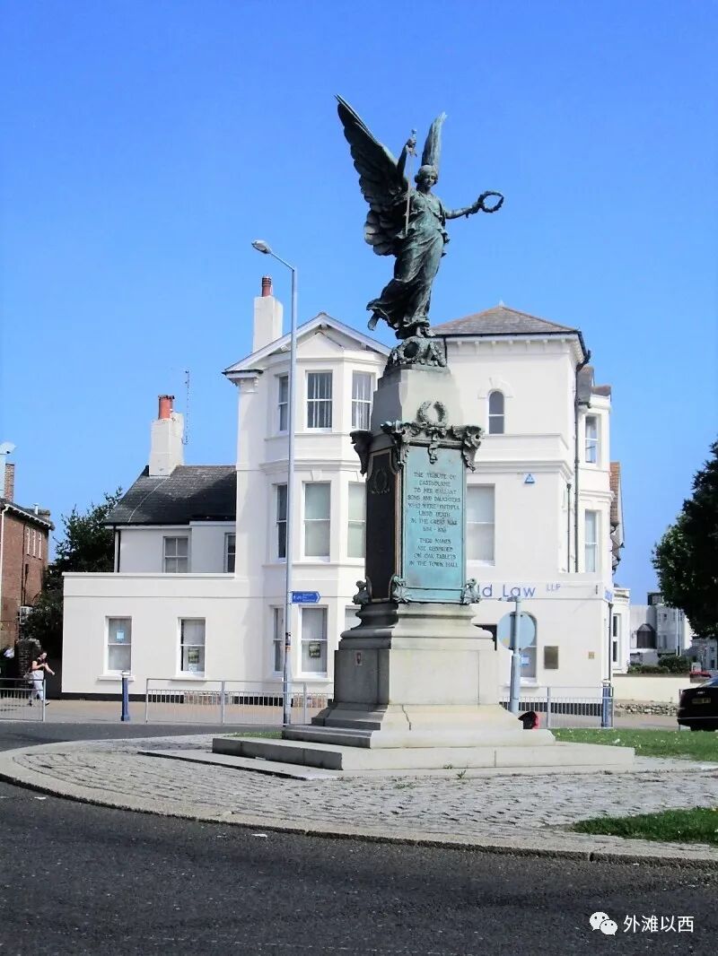 青铜雕塑名字叫“和平女神”,是由英国雕塑家Henry Fehr(1867年-1940年)创作,目前在英国一些重要城镇的街口可以发现他的同款作品,Eastbourne War Memorial, Memorial Roundabout, South Street, Eastbourne, East Sussex, England. Sculpted by Henry Charles Fehr and unveiled in 1920.