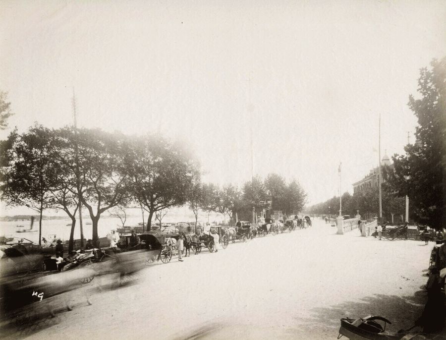 下图中有在法界外滩行驶的电车,那是法商电车电灯自来水公司在法界内开设的第一条有轨电车线路,1908年5月4日通车。当天典礼上,法国领事馆官员、公董局董事等坐上装扮一新的彩车,为法电站台壮势。这条位于法界内的电车线路东自十六铺起,沿着如今的淮海路往西至善钟路(今常熟路),后于该年7月又延伸至徐家汇,全长约8.5公里。