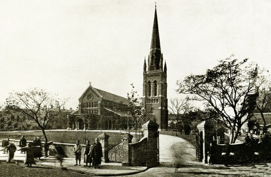 1893年Holy Trinity Church加盖钟楼后成为当时上海的第一高(该钟楼顶1966年毁,今已修复)。下图为未修复前留影,49路公交车起点站在此地。