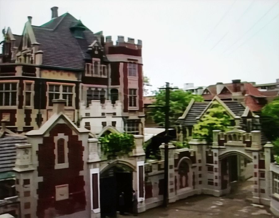 以前,拍电影电视剧采用实景比较多。如下,《围城》剧组和黄蜀芹导演借了安福路201号上海青年话剧团办公楼拍摄,彩色玻璃,我一看就看出来了,一帆风顺,此大宅后来是市长官邸,吴国祯一家曾住过一阵子;原始房东R.B.Mauchan是江南造船厂工程总监,彩玻图案就比较好理解了。