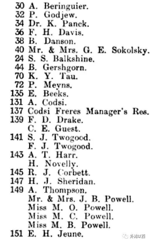 14号的Lang是不是请邬达克设计自宅的那个大老板,不是太清楚,27号(1936年改为53号)的D.M.Gubbay搿培先生全名为Gubbay,David Marcus,和延庆路130号是同一家族的成员,也是票据经纪人。59-65号是中国营业公司自持物业。