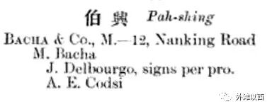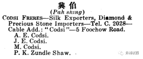 A.E. Codsi 和J.E.Codsi 是兄弟俩,丝绸出口商也是宝石进口商,算是最早在南京路上做生意的外商。Codsi Freres 和Bacha, M., & Co.属于你中有我,我中有你的那种关系,1908年Bacha自己做些颜料、清漆生意,1912年中国工商名录,伯兴洋行=Bacha, M., & Co.,