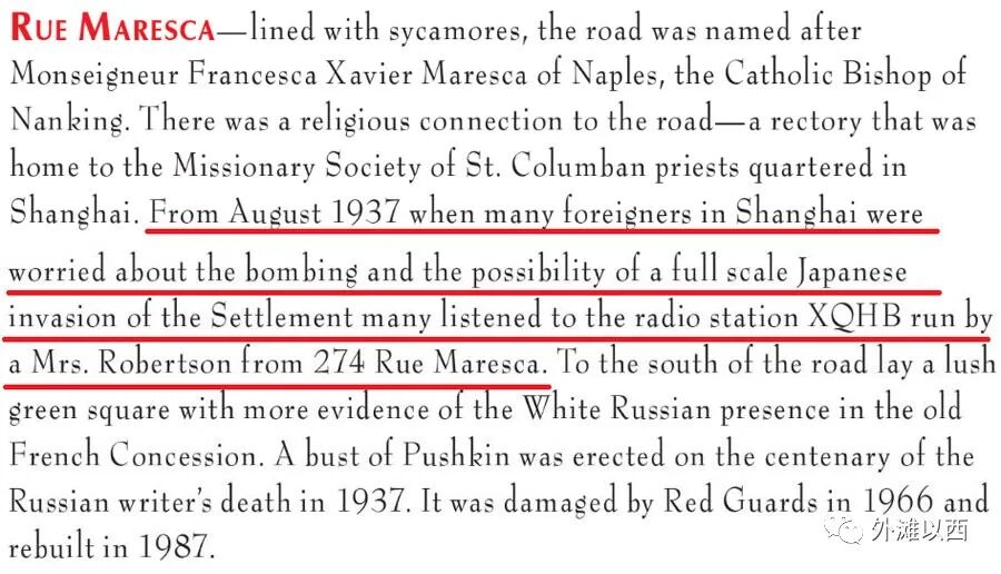 如下截图来自《The Old Shanghai A-Z》,作者Paul French是一个上海通,他告诉我们设在劳勃生夫人家的电台在孤岛时期对侨民有多重要,也透露了她在这里居住了至少十年。
