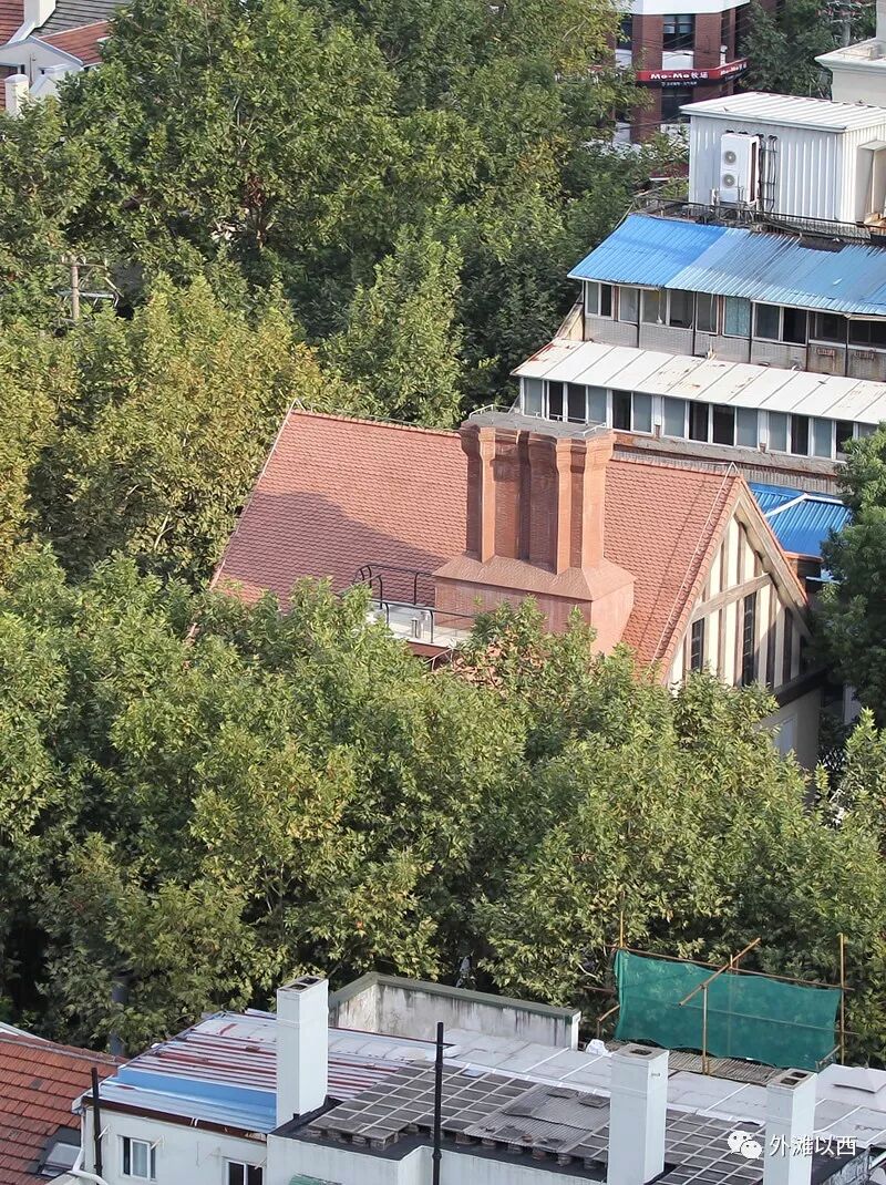 从巨鹿路四方新城的顶楼拍摄到的陕西南路82号的尖屋顶,多出了一个装饰物,烟囱,比隔壁的煤炭大王刘吉生宅的烟囱壮观。