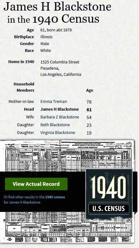 When Barbara Ellen Treman was born on 20 March 1885, in Mecklenburg, Hector, Schuyler, New York, United States, her father, Frank Walter Treman, was 30 and her mother, Emma Frances Allen, was 23. She married James Harry Blackstone about 1903. They were the parents of at least 2 sons and 4 daughters. She lived in South Pasadena, Los Angeles, California, United States in 1930 and Pasadena Judicial Township, Los Angeles, California, United States in 1940. She died on 29 December 1948, in Los Angeles, California, United States, at the age of 63, and was buried in Forest Lawn Memorial Park, Glendale, Los Angeles, California, United States.
