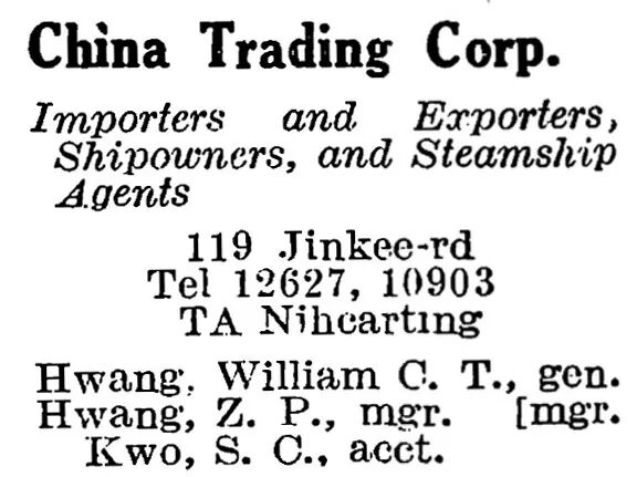 The principalbusiness of the firm has been the importation of sugar and the exportation of sesame seeds.Appreciating the growing importance of the shipping business asan adjunct to China's trade, Mr. Hwang in the Spring of 1934 beganto build up a shipping department and is now operating two largeocean steamers, the "China Importer" and the "China Exporter," of8200 and 9037 tons deadweight, respectively, and a smaller ship, the"China Trader," of 3100 tons.【Who's Who in China(1936)】
