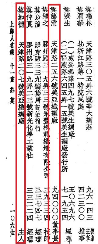 1931年,福开森路,莫觞清60岁。我们再搬运点莫家史料。1936年上海工商人名录和1941年上海重要人名录记载,莫觞清任美亚织绸厂董事长。