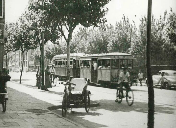 1953年我们搬进了南昌路550弄的丙弄10号,那会儿叫钱家塘。这块地方后来成了全国闻名的襄阳市场,我们家在那住了二三十年,直到动迁。隔了那么多年,回想起和父亲一起的日子,很是留恋。父亲每天乘45路公共汽车上下班。车站在靠近汾阳路的淮海中路上,离家不远,但要过两条马路。黄昏,暖暖的,西斜的太阳,透过梧桐树叶洒在街上。路上的车不像现在那么多,行人也不多。我和二弟靠在音乐学院的篱笆墙边,手上摆弄着纸折的船或是什么,等着墨绿色的45路车,等着“阿爸”(邱必昌:《我的父亲邱岳峰》)。