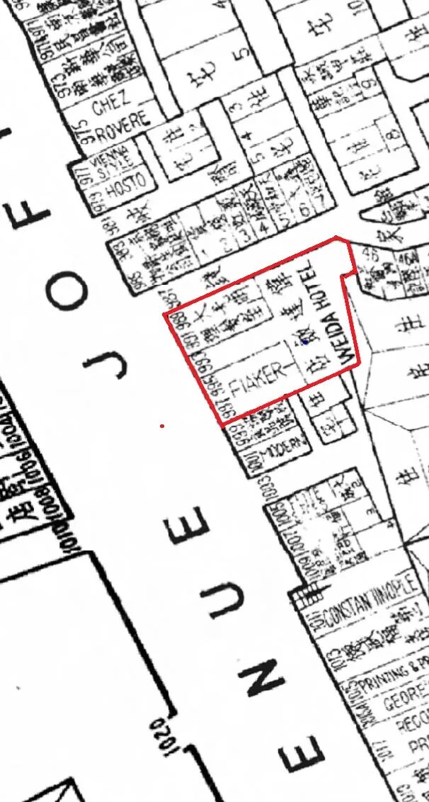伟达饭店与邻居建筑关系,看到画面右侧洋房顶上有个像兔子耳朵的广告牌吗?美丰伙食店,和万兴食品号是隔壁邻居。这里还有虞永兴以及公泰,吃货集聚地。链接点进去看看: