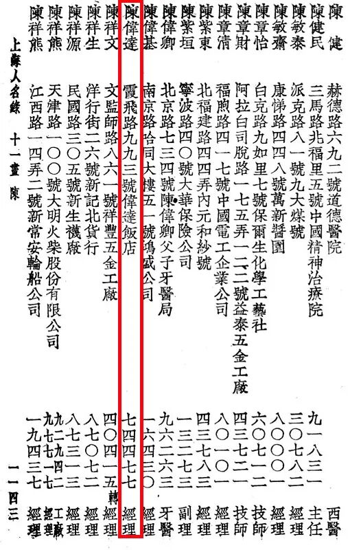 陳偉達(陳子翰)年50歲,江蘇南匯人;偉達飯店公寓總經理,霞飛路993號;電話:74477、76301;長子尙文年三十歲,任經理,次子尙賢年廿六歲,任副經理(上海人才小史,1945年版)。