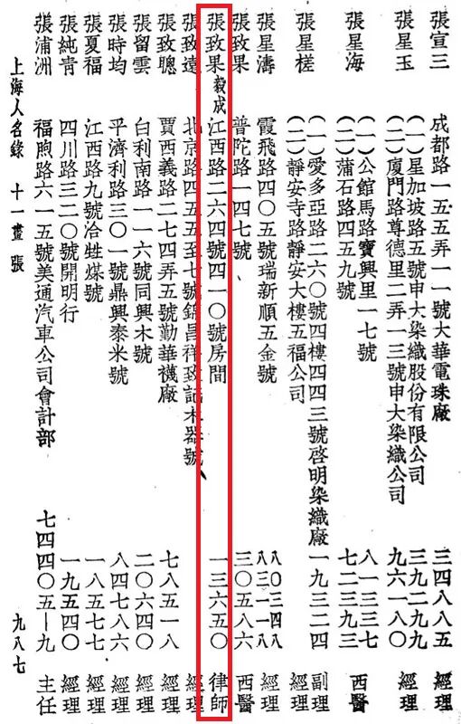 新新闻写作的有趣在于获得最原始素材后,写作者可以在时空中做合理的浮想联翩,实际生活中,很多事情看上去是巧合,其实,人物关系和历史渊源都命中注定,如姻亲、如同乡、如校友、所谓志同道合。.....,住弄堂底7号人家没悬念,1947年行号路图录上标注:张致果律师。