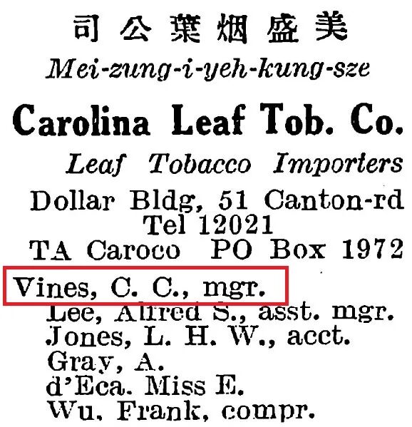 不展开了,嵇元红是徐宝彝太太。4号住户为美盛烟叶公司经理Vines先生,从其公司买办吴发来(Wu Frank)简介里,我们了解到美盛烟叶公司1941年业务停顿,吴在此洋行干了十年(1931-1941年),美盛烟叶公司在广东路51号大来大楼312室办公。看来,美盛烟叶公司业务停顿后,Vines先生在上海生活得还是很滋润。