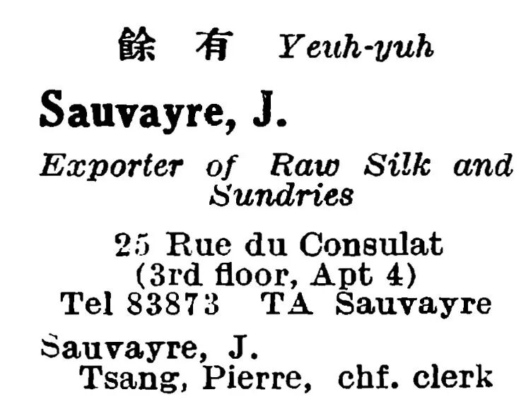 6号住户为法国公董局董事、回力球场董事、逸园赛狗场副总董沙维,他同时是“有余洋行”大班。前三项职务证明,他紧跟步维贤(Félix Bouvier)。深入检索沙维先生简历,发现他1912年已在上海,大昌洋行的验丝师、代签有效人。1915年创办有余洋行,1939年,沙维住辣斐得路1363号克莱门公寓,夫妻两人带一个女儿。