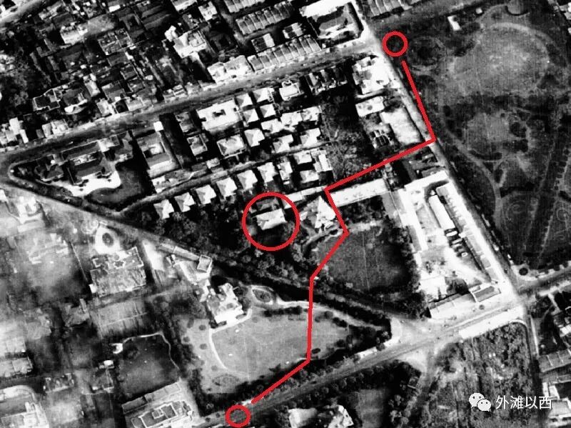 我们在1948年上海天地图做了行走标注。大的红圈圈为延庆路18弄10号。